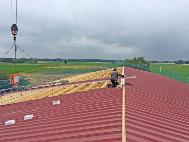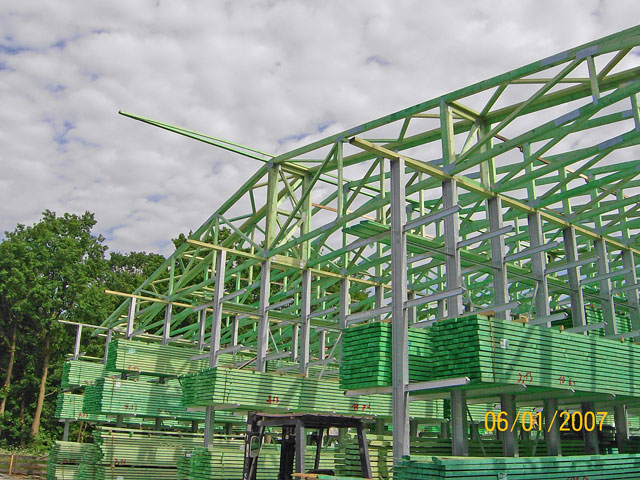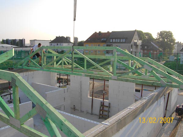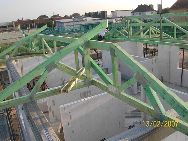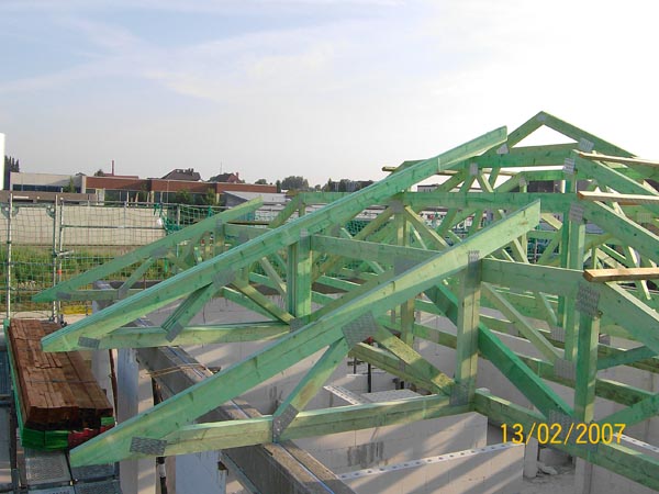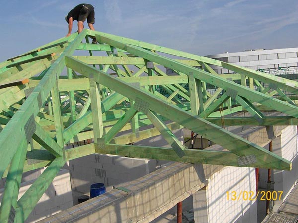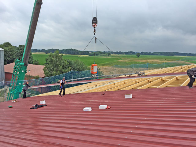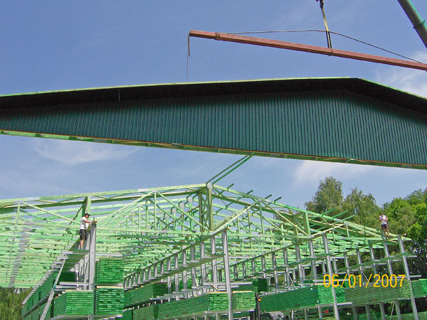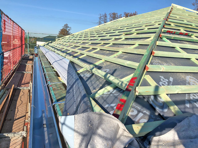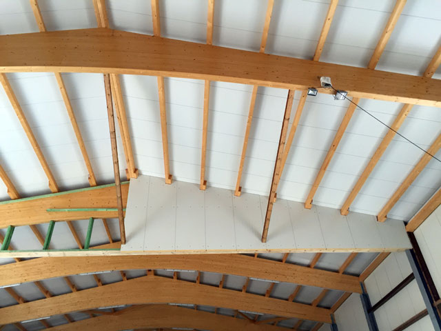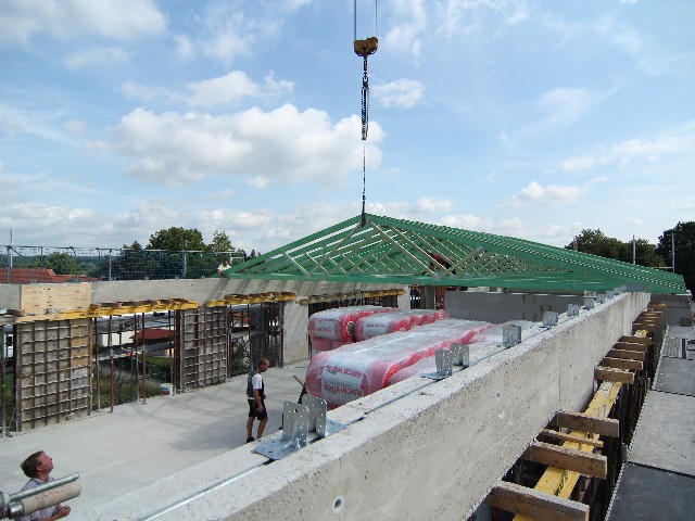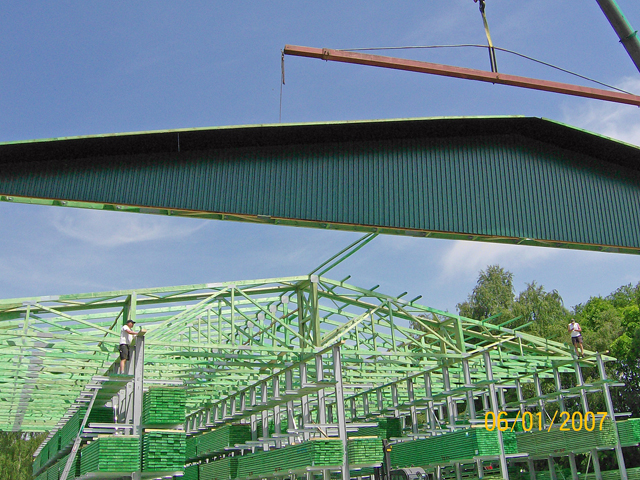 Die Dachkonstruktion wurde aus Brettschichtholzbindern und Koppelpfetten hergestellt. Die Dacheindeckung besteht aus isoliertem Dachblech.