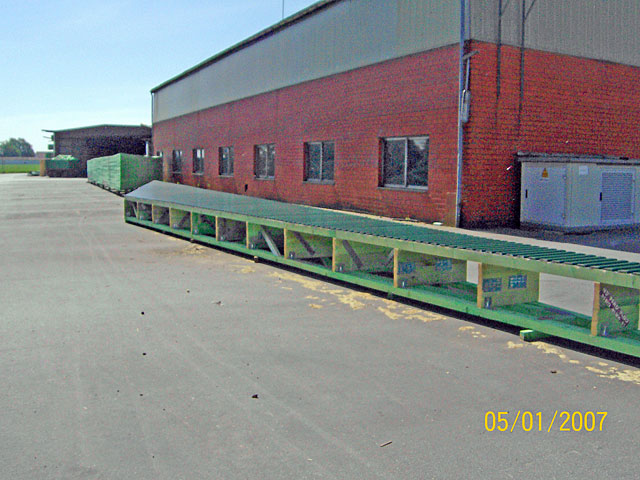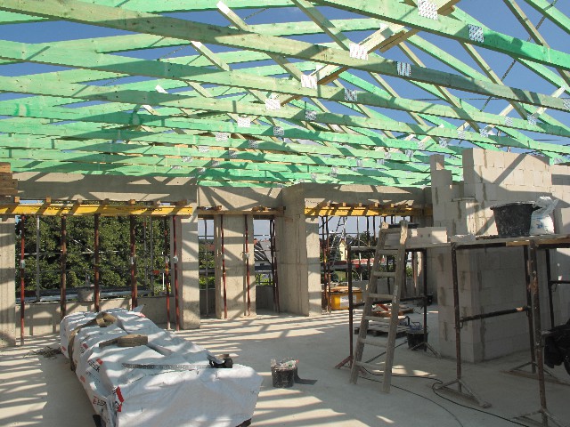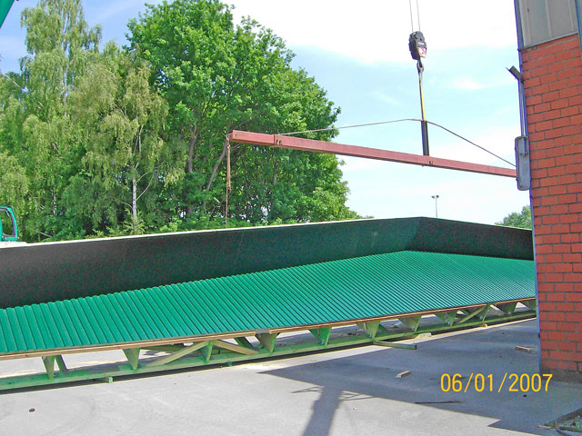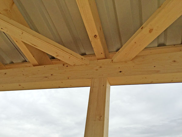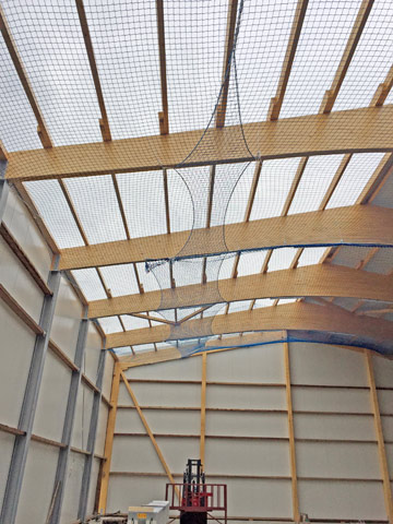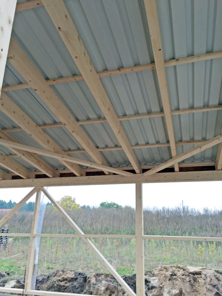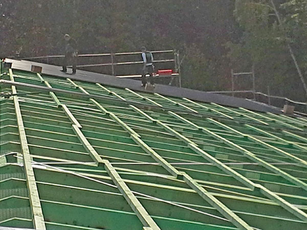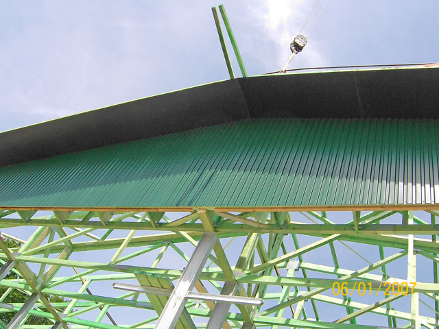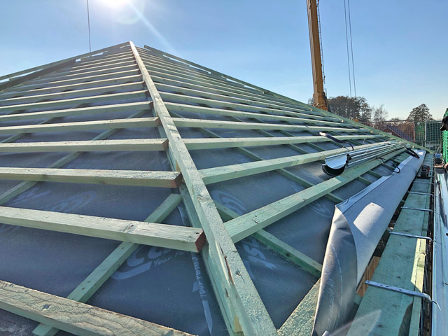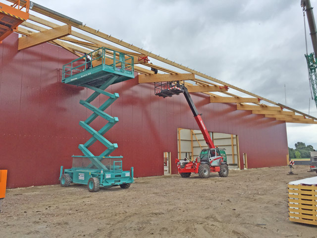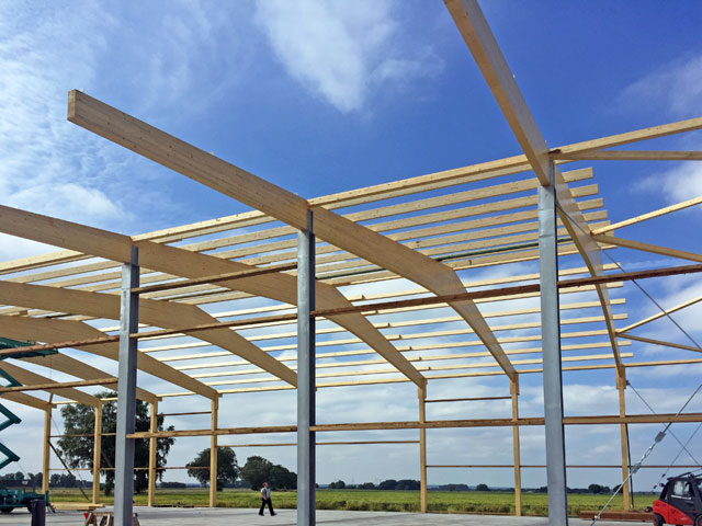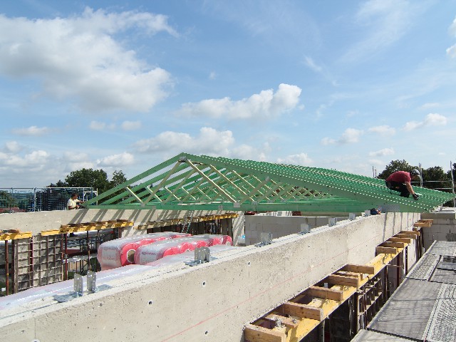 Die Dachkonstruktion wurde aus Brettschichtholzbindern und Koppelpfetten hergestellt. Die Dacheindeckung besteht aus isoliertem Dachblech.