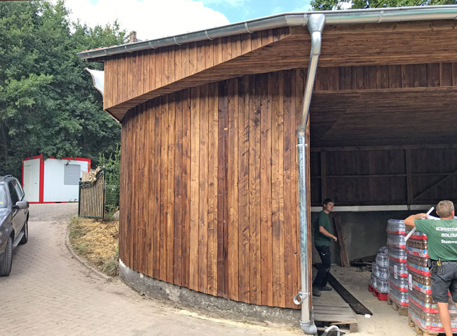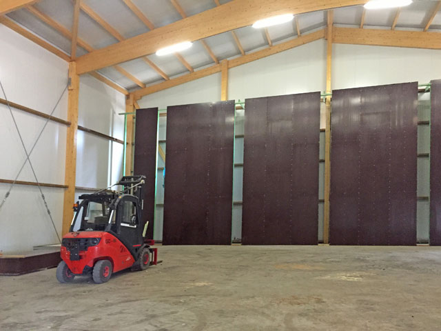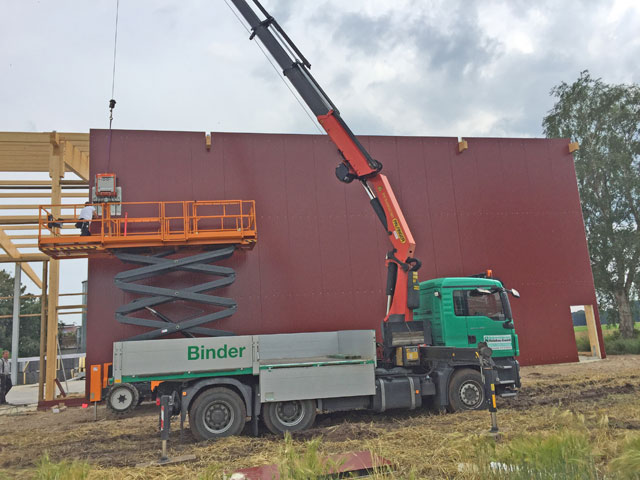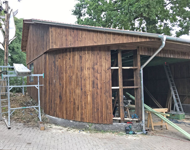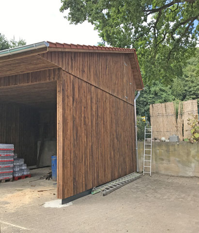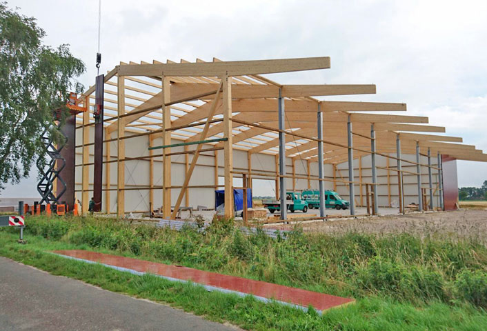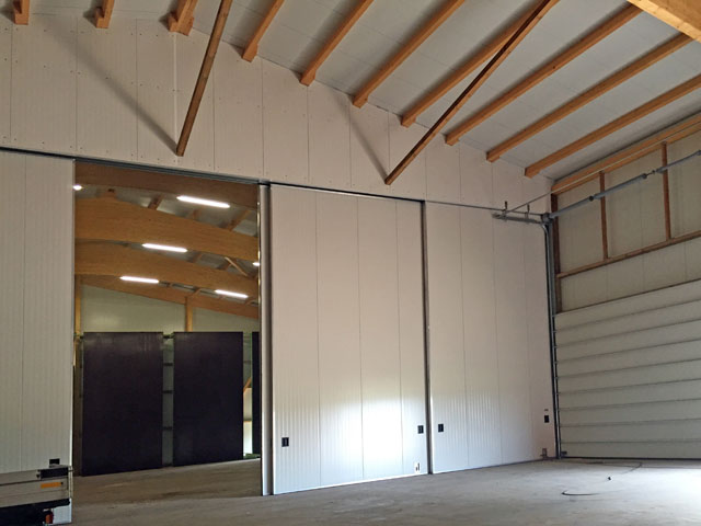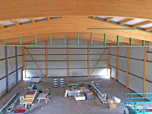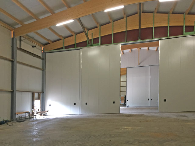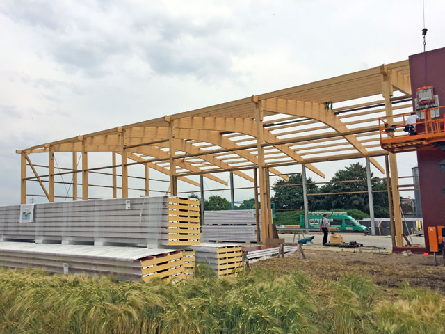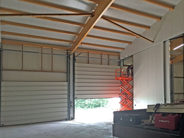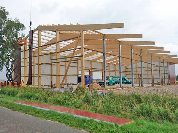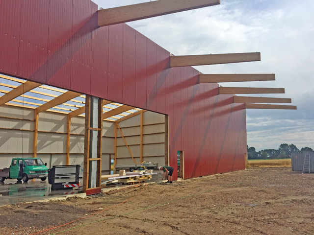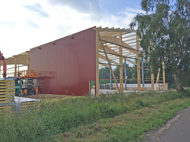 Die Wandkonstruktion besteht aus Stahlstützen und Holzwandriegel. Sie wurde verkleidet mit isoliertem Wandblech.