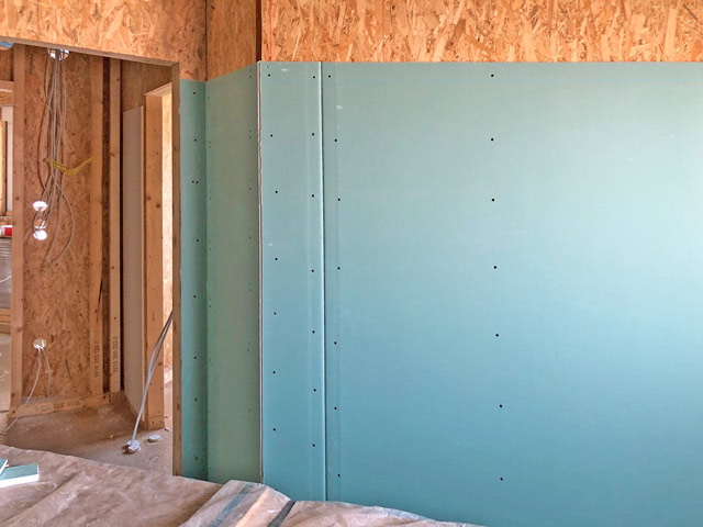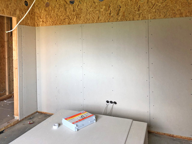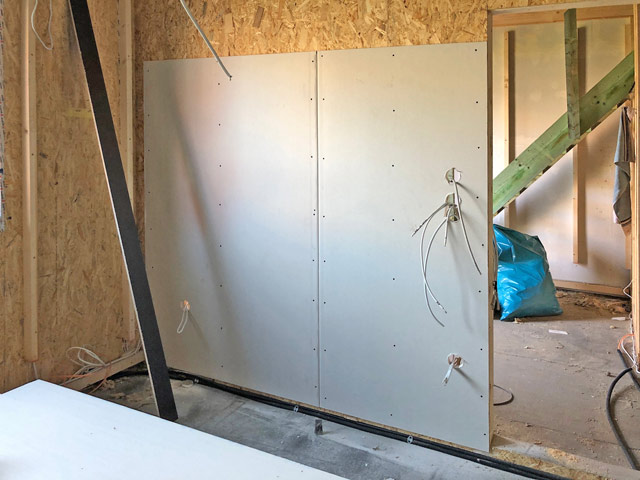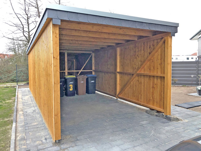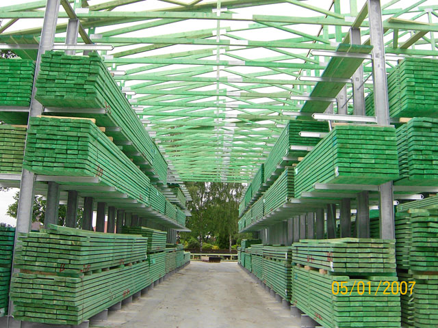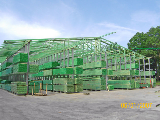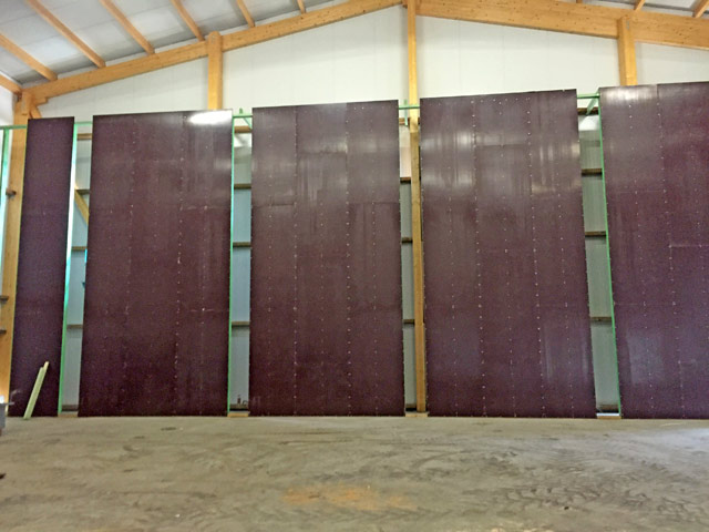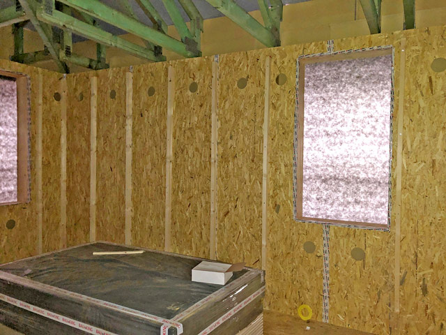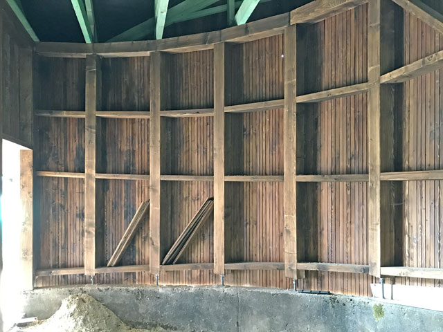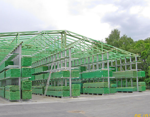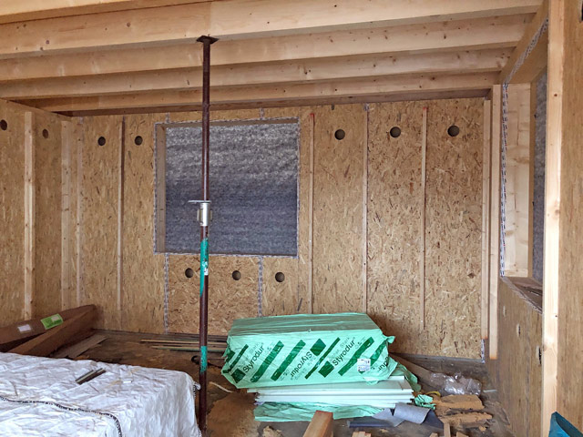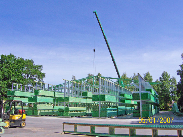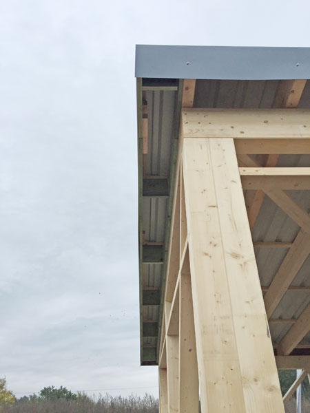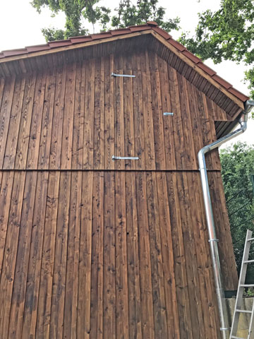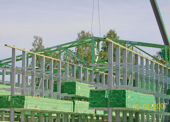 Die Wandkonstruktion besteht aus Stahlstützen und Holzwandriegel. Sie wurde verkleidet mit isoliertem Wandblech.