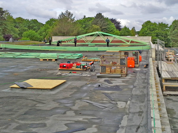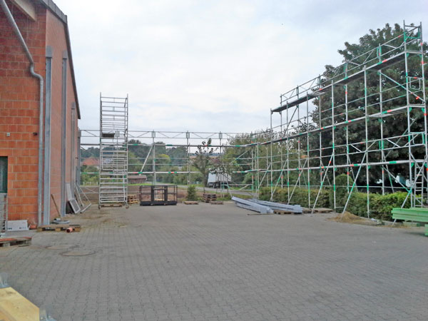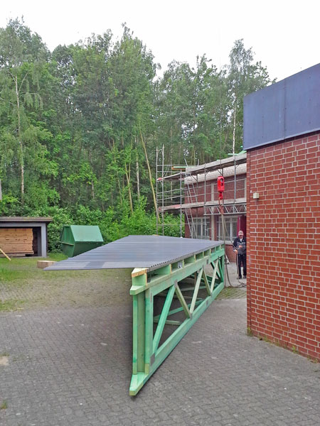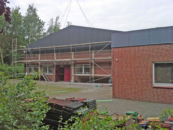Hier wird das sanierungsbedürftige Flachdach des Handwerkbildungszentrum Lübbecke durch ein flaches Satteldach ersetzt.