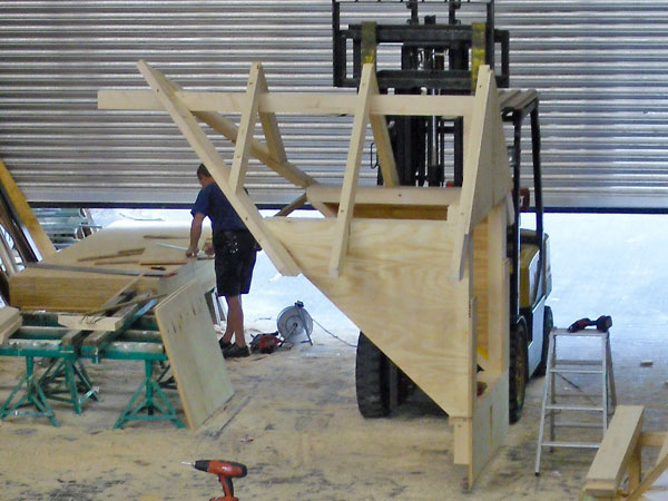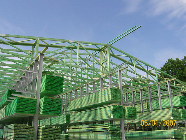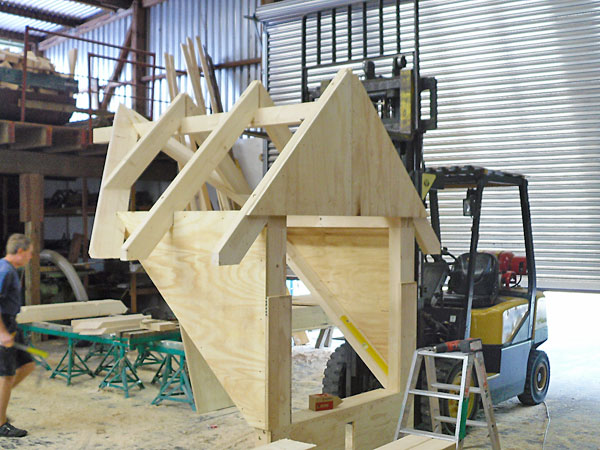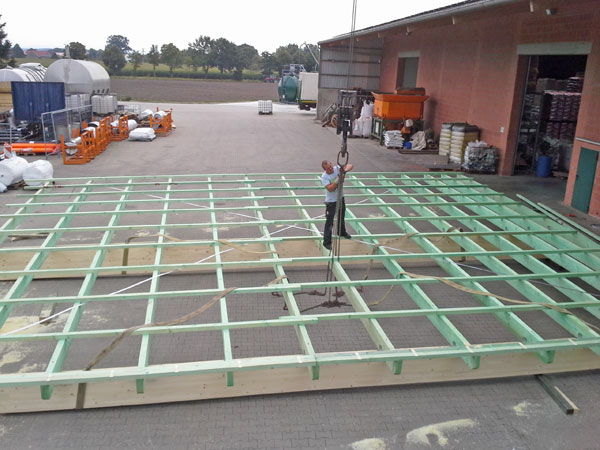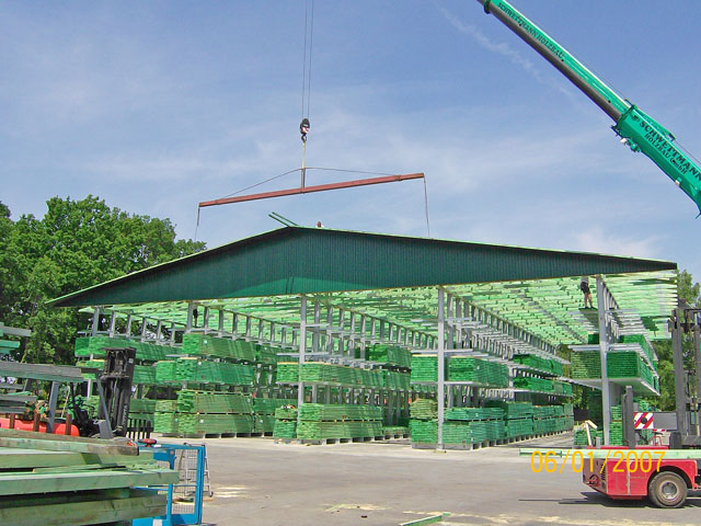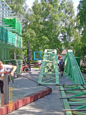 in der Zimmereihalle der Firma Schwettmann. Das Richten der fertigen Elemente geschieht mit Hilfe eines Schwettmann-Ladekrans