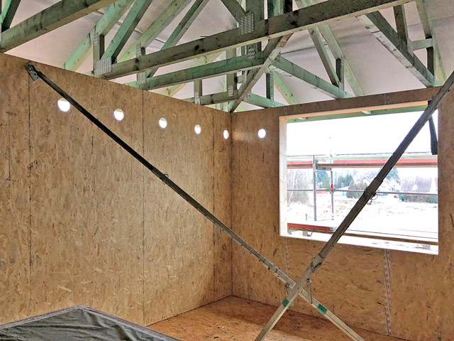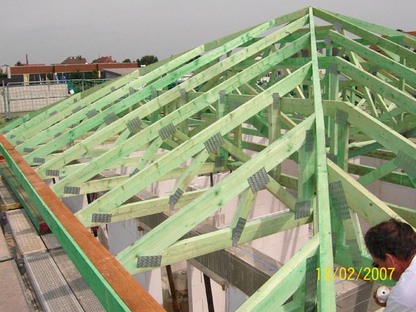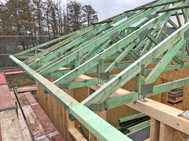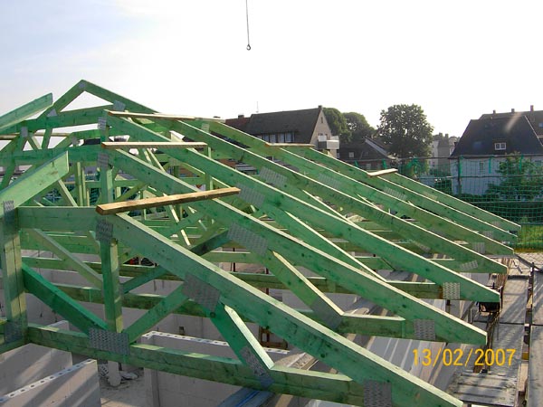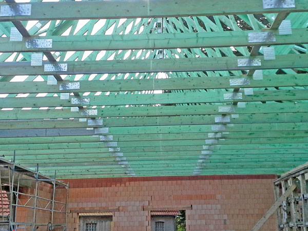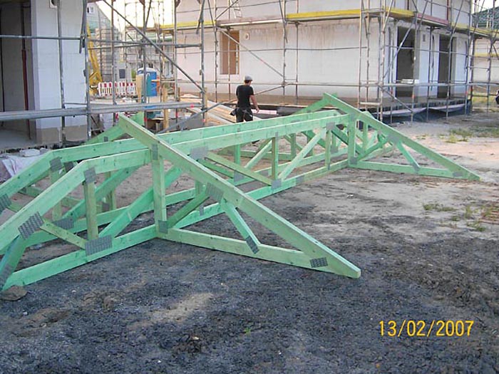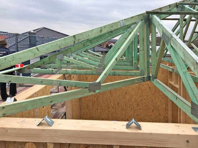 Lieferung und Richten der Satteldach-Nagelplattenbinder bei gleichzeitiger Deckenunterkonstruktion
